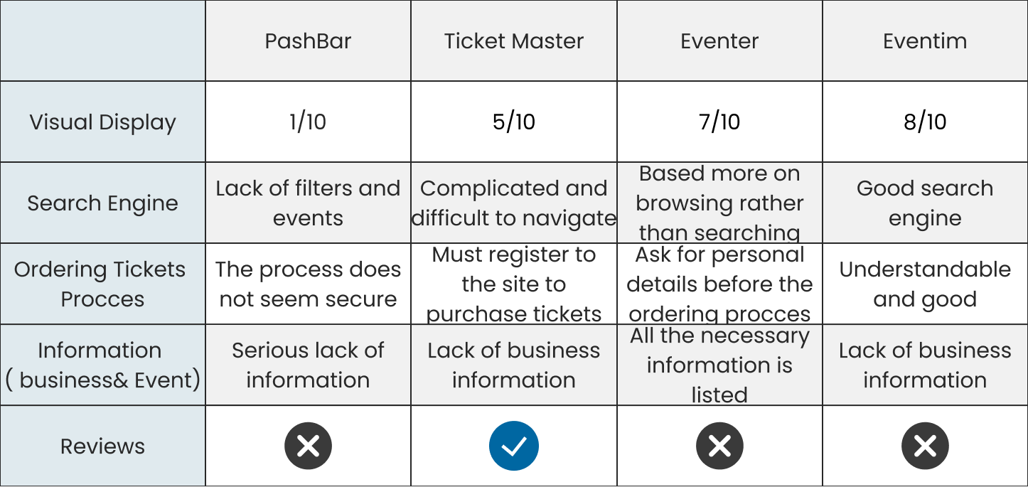 My preliminary research involved researching four systems available on the market currently. I compared four competitors based on five different parameters: visual display, search engine, ordering process, information (business and event) and reviews..